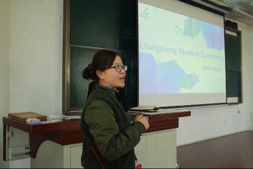 张南同学对社区基本工作制度的修改进行汇报。她就工作岗位的编排,工作职责的加强,工作内容的细化等方面向全体成员展现了一个逐步成长成熟的学生工作组织。